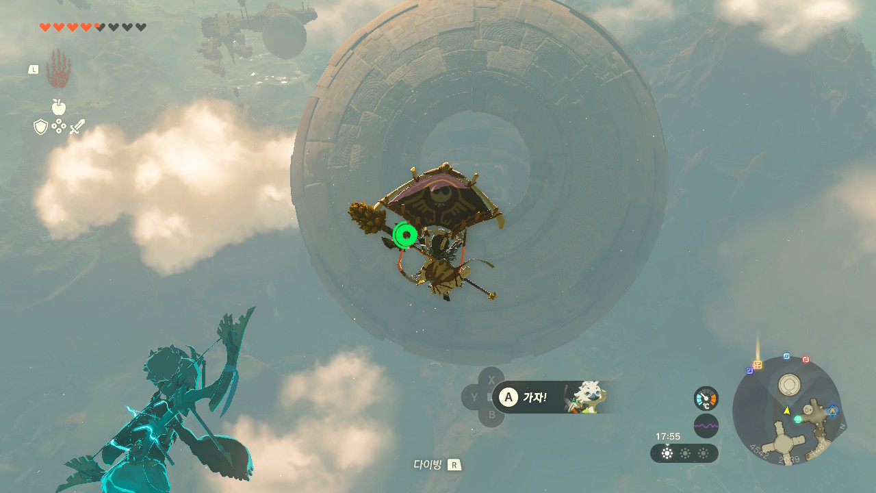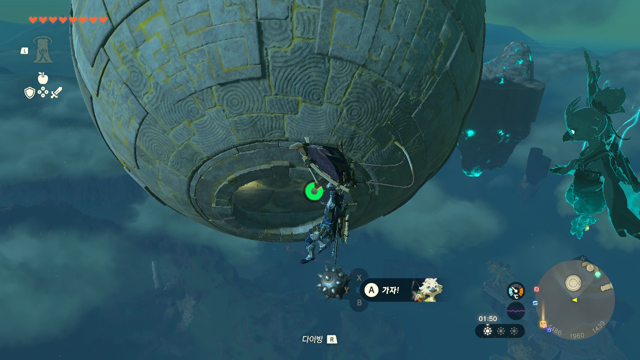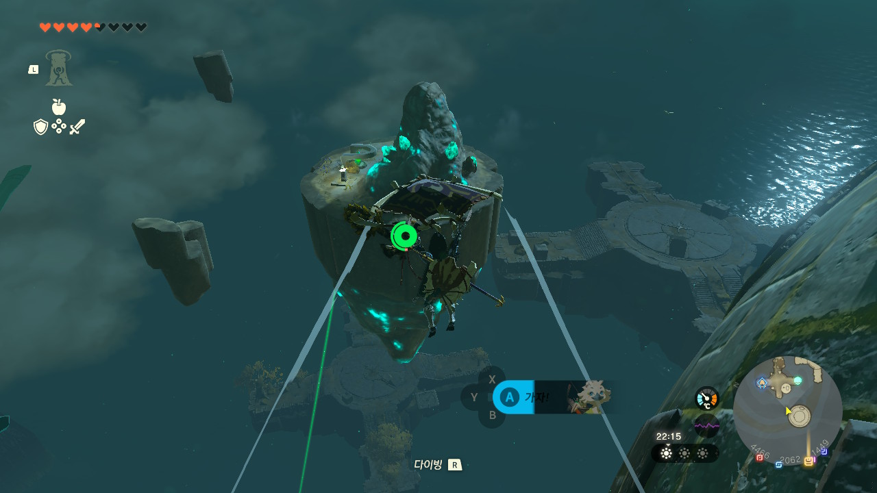 그리고 바닥에 떨어지지 않게 사당이 있었던 첫 번째 하늘섬에 잘 조준하여 돌을 떨어뜨려줍니다.