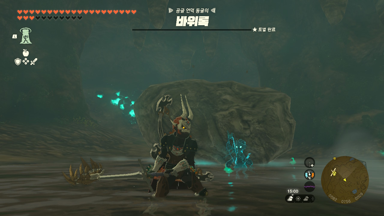 동굴 안에 있는 바위록을 해치워주신 후, 벽을 살펴보면 야광석이 크게 박혀있는 곳이 있습니다.