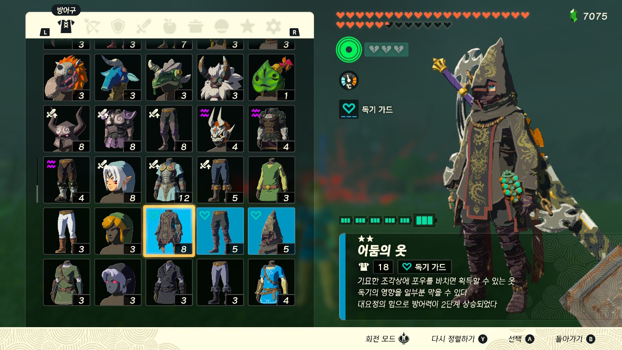 어둠 세트는 독기의 영향을 일부분 가드해주는 효과가 있습니다. 사진처럼 세트를 입으면 여분의 파랑색 하트가 3개 생기고, 독기 데미지가 여분의 하트로 들어갑니다.