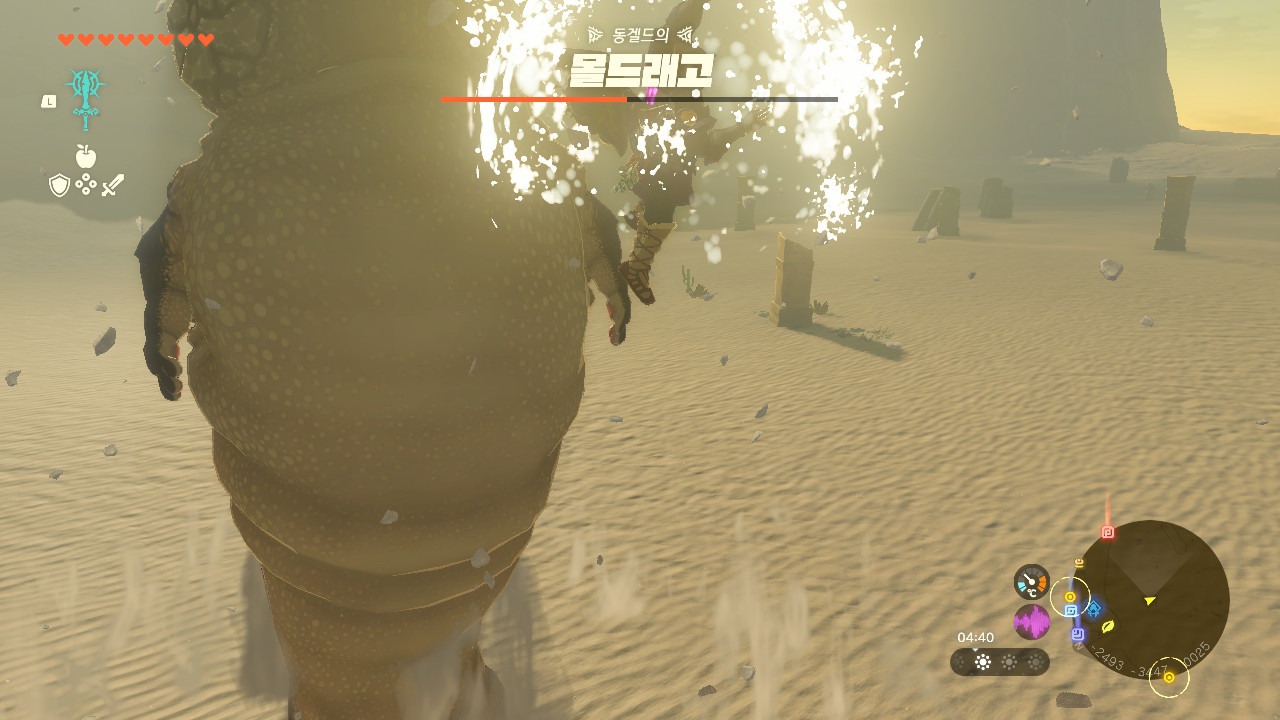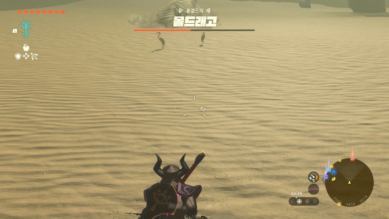 바위 위에 올라가서 모래 바닥에 화살을 쏴주면 그 위치에 몰드래고가 튀어오릅니다.