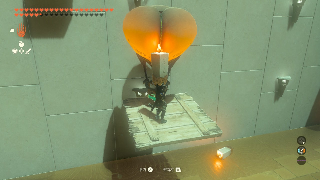 문 앞에 열기구를 놔주시고, 열기구 중앙에 촛대를 붙여주시면 열기구가 상승하면서 버튼을 누르게 됩니다.
