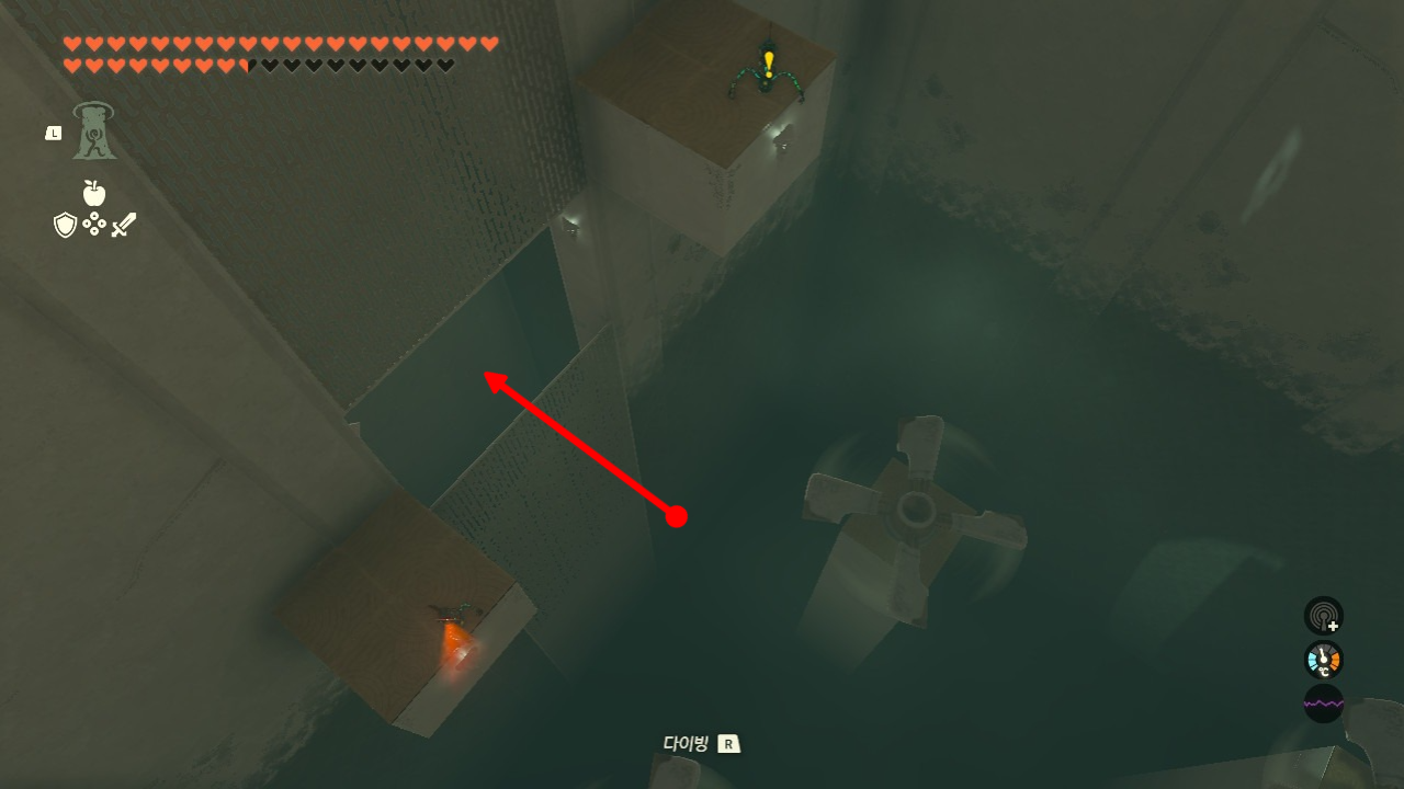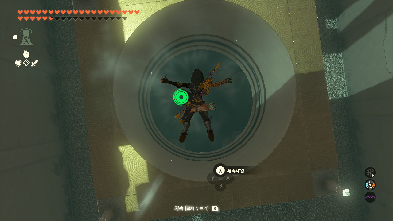 패러세일을 탄 상태에서는 상승기류를 때문에 내려갈 수가 없으니 패러세일을 해제하시고, R을 눌러 가속해 빠르게 통과해주세요. 그 다음 패러세일을 접었다 폈다를 사용하여 바닥에 안전하게 착지합니다.