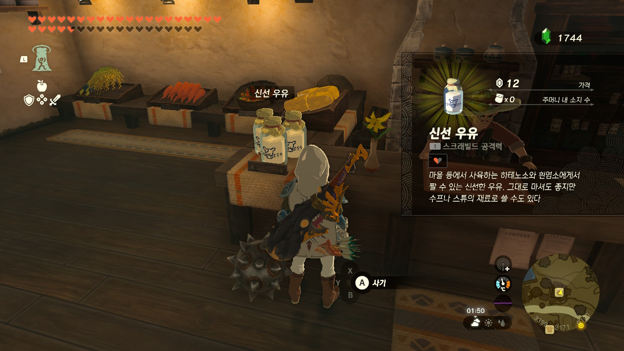 하이랄 쌀과 신선우유는 하테노 마을의 만물상 (추천) 혹은 카카리코 마을 서쪽의 이동 상인 레겐에게서 구매, 해품이꽃은 하늘섬에서 파밍하시면 됩니다.