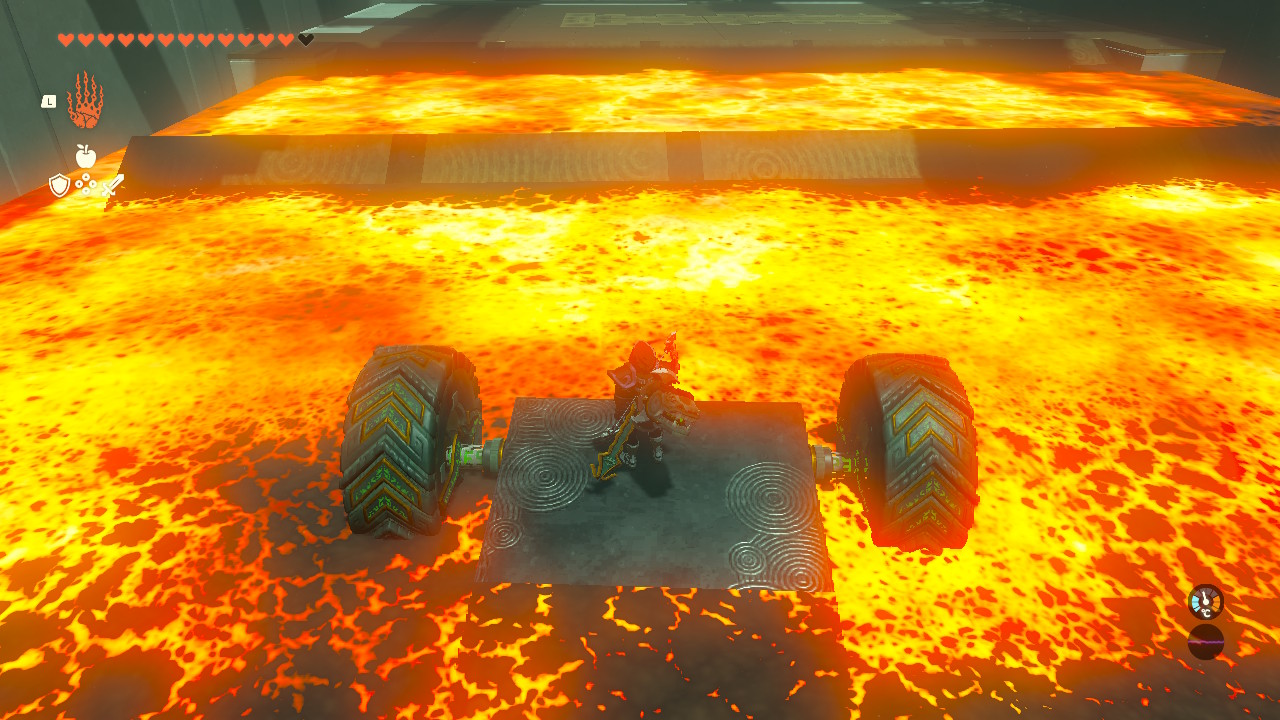 앞에 보이는 장치 두개를 이어붙인 후 가동시켜 용암지대를 건너갑니다.